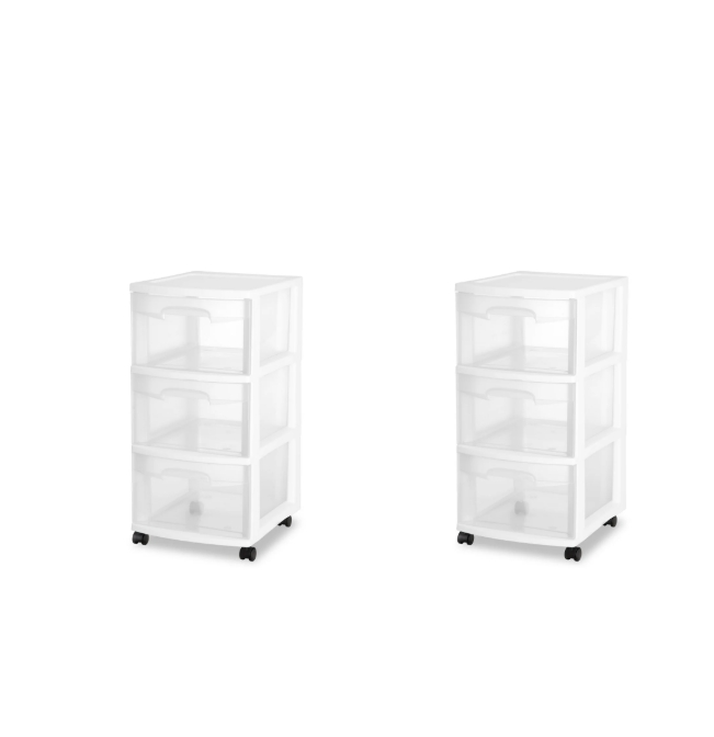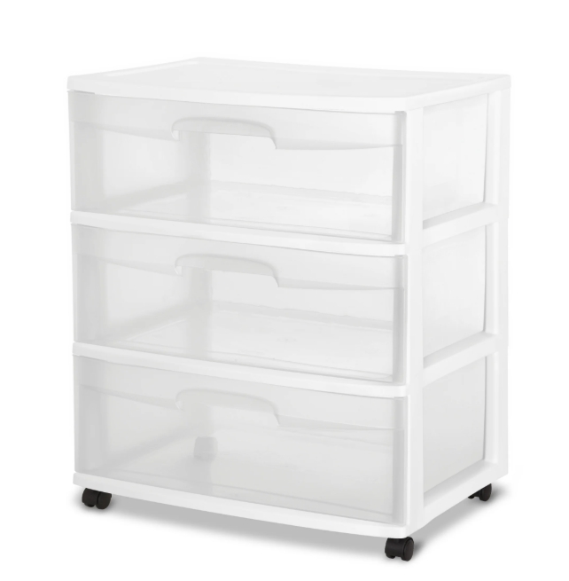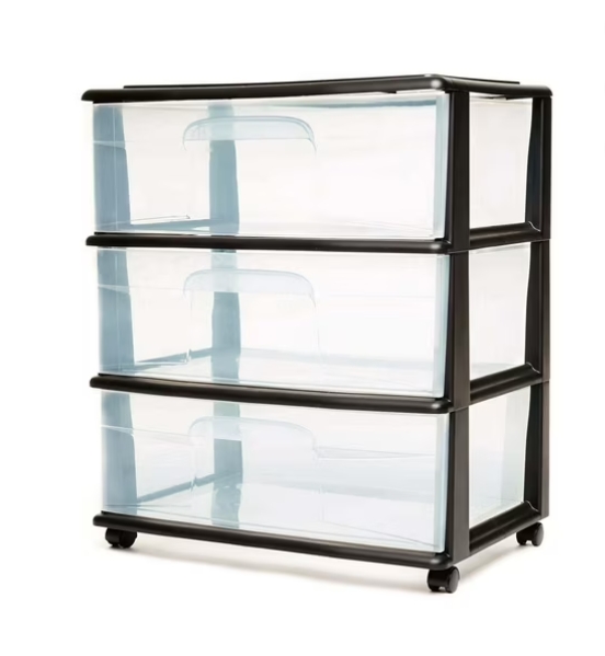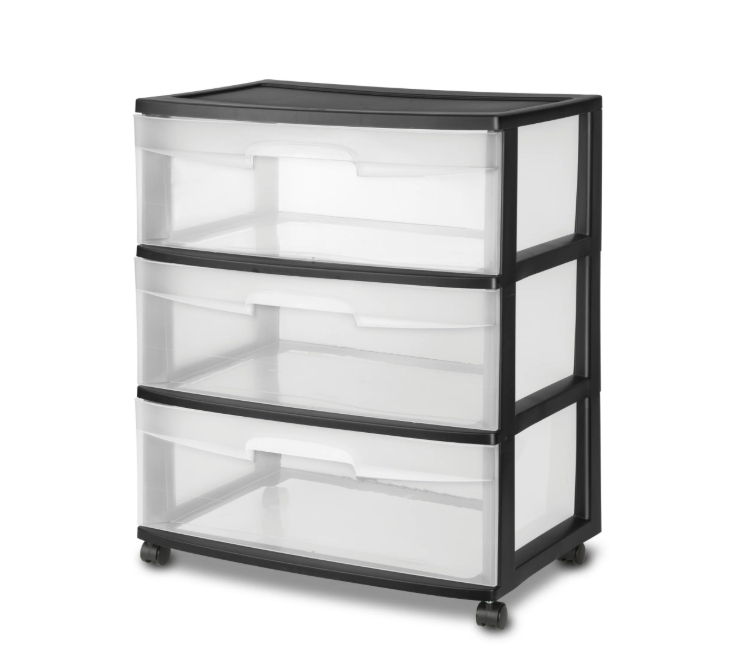 Sterilite Storage Drawer, 3 Drawer Wide Plastic Storage Cart with Clear Pull Out Drawers, Black