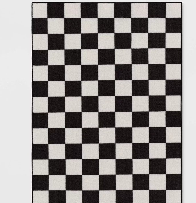 - Rectangular rug with a checkered design in black and white