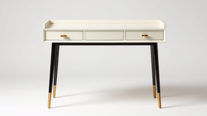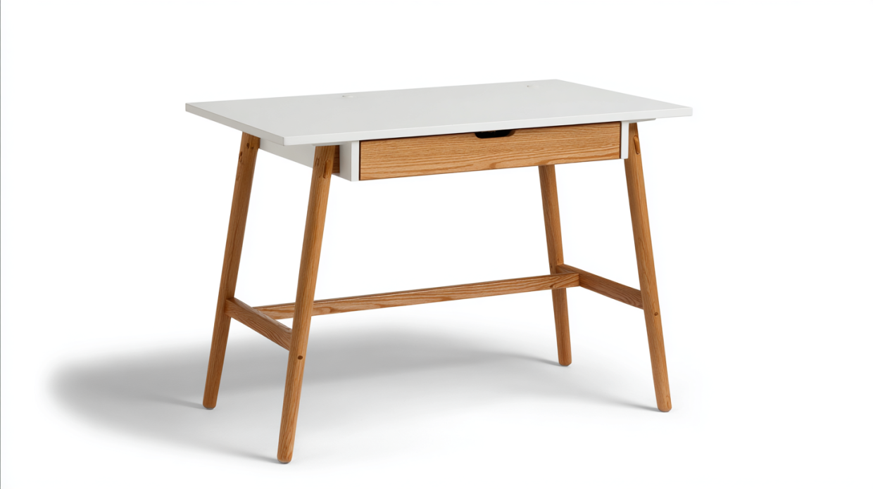 Brief Description: This is the flagship model in the Room Essentials lineup and one of the most sought-after compact desks on the market today. Built from durable MDF with a clean white finish, it measures 43.1 inches wide, 24 inches deep, and 30 inches tall — hitting the industry-standard desk height for comfortable seated work. The desk features built-in storage drawers with wooden handles, giving you a tidy place to stow notebooks, chargers, and office supplies. Its contemporary/modern styling works equally well in a dorm room, a bedroom nook, or a small apartment. It’s lightweight enough to reposition easily and backside-finished, meaning it can float freely in a room without being pushed against a wall.